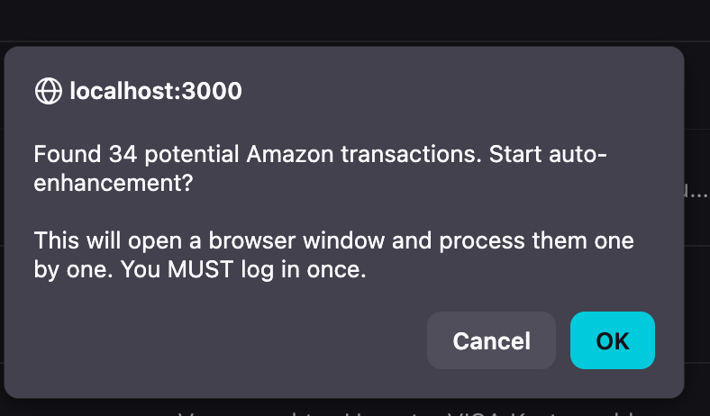 It was mid-afternoon on Day 3 (okay, not technically night, but I was coding in spirit). I’d just finished the Amazon scraper prototype. It was working beautifully, enhancing transactions right in the list with a clickable badge.