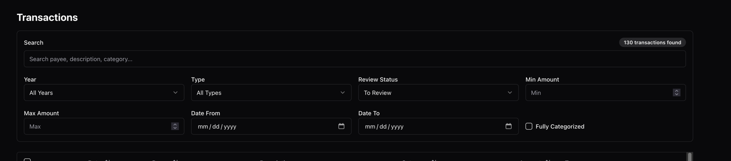 Full-text search - Search across payee, description, and transaction details